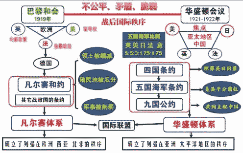 《凡爾賽和約》規(guī)定的凡爾賽體系和《四國條約》、《五國條約》、《九國公約》規(guī)定的華盛頓體系。
