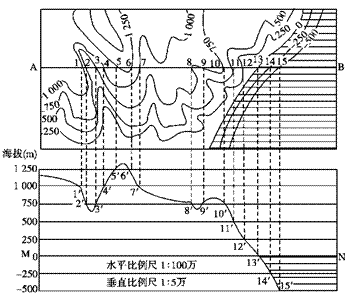 確定地形剖面圖的垂直比例尺及水平比例尺是繪圖中的難點及重點,垂直比例尺一般是原圖的5、10、15、20倍,倍數(shù)越大,起伏越明顯。水平比例尺一般與原圖一致。在新圖中繪水平線MN,按水平比例尺的大小定出剖面范圍為橫坐標,按垂直比例尺的大小,繪出縱坐標。