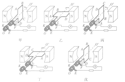 如圖所示表示了線圈ABCD在磁場中逆時(shí)針轉(zhuǎn)動一周的情況。前半周(甲→乙→丙)電流沿著DCBA方向流動(由右手定則分別判斷ABCD邊切割磁感線,而AD、BC邊不切割磁感線),后半周(丙→丁→戊)電流方向?yàn)锳BCD,兩種情況交替出現(xiàn),形成交變電流。