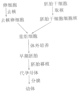 1、將胚胎干細胞核移植到去核的卵細胞中,經(jīng)過胚激活、胚胎培養(yǎng)、胚胎移植后受體產(chǎn)生克隆動物,操作流程如下: