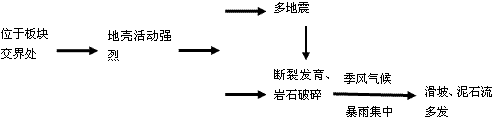 ①暴雨泥石流:西部和半濕潤、半干旱氣候過渡帶