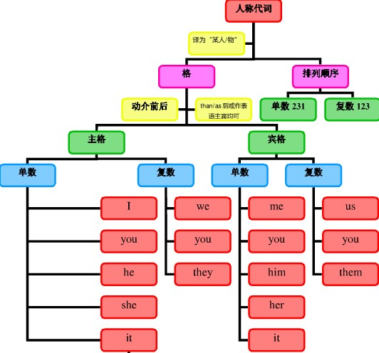 人稱代詞分為主格和賓格形式,并有人稱的單復(fù)數(shù)形式。按所替代人稱的不同分為第一人稱、第二人稱和第三人稱。