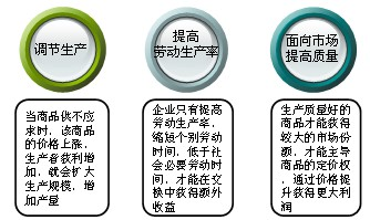 價(jià)格變動(dòng)對(duì)生產(chǎn)經(jīng)營(yíng)的影響的三條內(nèi)容實(shí)際上是價(jià)值規(guī)律發(fā)生作用的三種表現(xiàn)形式。調(diào)節(jié)生產(chǎn)規(guī)模是從“增加或減少產(chǎn)量”上來(lái)說(shuō)的;提高勞動(dòng)生產(chǎn)率是從“降低成本”上來(lái)說(shuō)的;生產(chǎn)適銷對(duì)路的高質(zhì)量產(chǎn)品則是從“提高質(zhì)量”上講的。