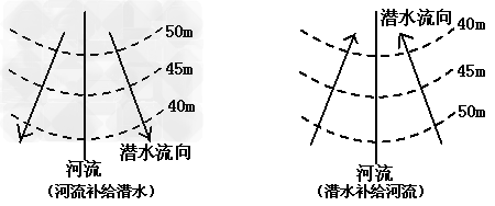 方法1:首先,作出河流兩岸的潛水流向;然后,依據(jù)潛水的流向進(jìn)行判斷。若潛水的流向向河流匯合,則潛水補(bǔ)給河水;若潛水的流向向河流分開,則河水補(bǔ)給潛水