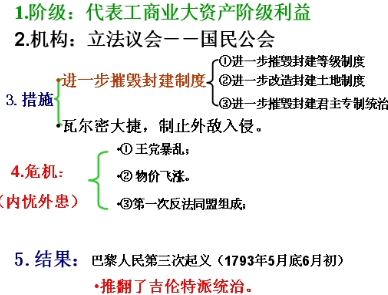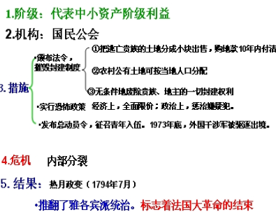 | 雅各賓派 | 1793.6?1794.7 | 中小資產(chǎn)階級 | 國民公會 | 結(jié)束封建制度;實行恐怖政策;全國動員法令 |