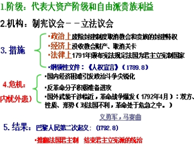 | 君主立憲派 | 1789.7?1792.8 | 大資產(chǎn)階級和自由派貴族大資產(chǎn)階級和自由派貴族 | 制憲議會 立法議會 | “八月法令” ; 《人權(quán)宣言》; 1791年憲法 |