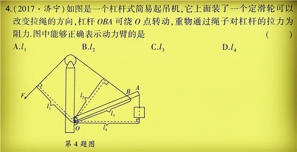很顯然,本題的起吊臂OA是一個(gè)杠桿,題意讓尋找動(dòng)力臂,這道題是一道非常典型的易錯(cuò)題,有一部分學(xué)生錯(cuò)以為動(dòng)力臂為圖中的L1,之所以學(xué)生有這樣的錯(cuò)誤認(rèn)識,是沒有把動(dòng)力的方向以及作用點(diǎn)搞清楚!我們一定要搞明白,動(dòng)力的作用點(diǎn)必須是在杠桿身上,動(dòng)力的方向也必須從杠桿身上起步開始畫。