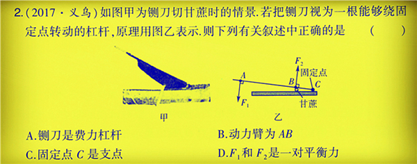 我們研究一下這道物理題,很顯然,鍘刀切甘蔗時(shí),是圍繞著C點(diǎn)轉(zhuǎn)動(dòng)的,按照支點(diǎn)的定義,“杠桿繞著轉(zhuǎn)動(dòng)的點(diǎn)就是支點(diǎn)”,C點(diǎn)就是該杠桿的支點(diǎn)。根據(jù)力臂的定義:“力臂是支點(diǎn)到動(dòng)力作用線或者阻力作用線的距離”!所以,從乙圖可以看出來,動(dòng)力臂應(yīng)該是CA,阻力臂應(yīng)該是CB。再根據(jù)省力杠桿與費(fèi)力杠桿的判斷方法,當(dāng)動(dòng)力小于阻力時(shí),也就是動(dòng)力臂大于阻力臂時(shí),為省力杠桿;當(dāng)動(dòng)力大于阻力時(shí),也就是動(dòng)力臂小于阻力臂時(shí),為費(fèi)力杠桿!通過乙圖可知,動(dòng)力臂CA大于阻力臂CB,所以為省力杠桿!另外對于本題中的D選項(xiàng),由于動(dòng)力與阻力大小不相等、作用不在一條直線上,所以動(dòng)力與阻力不滿足平衡力的條件。